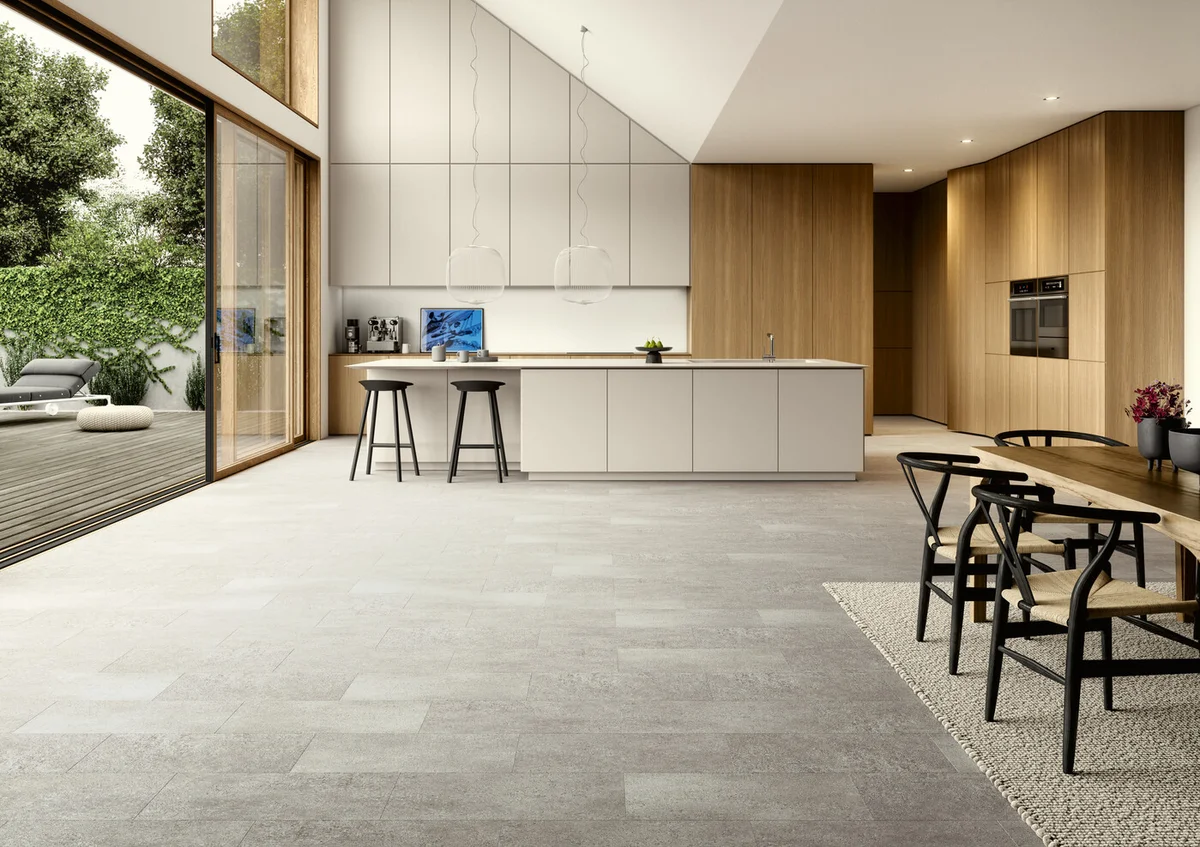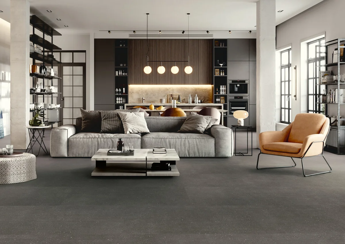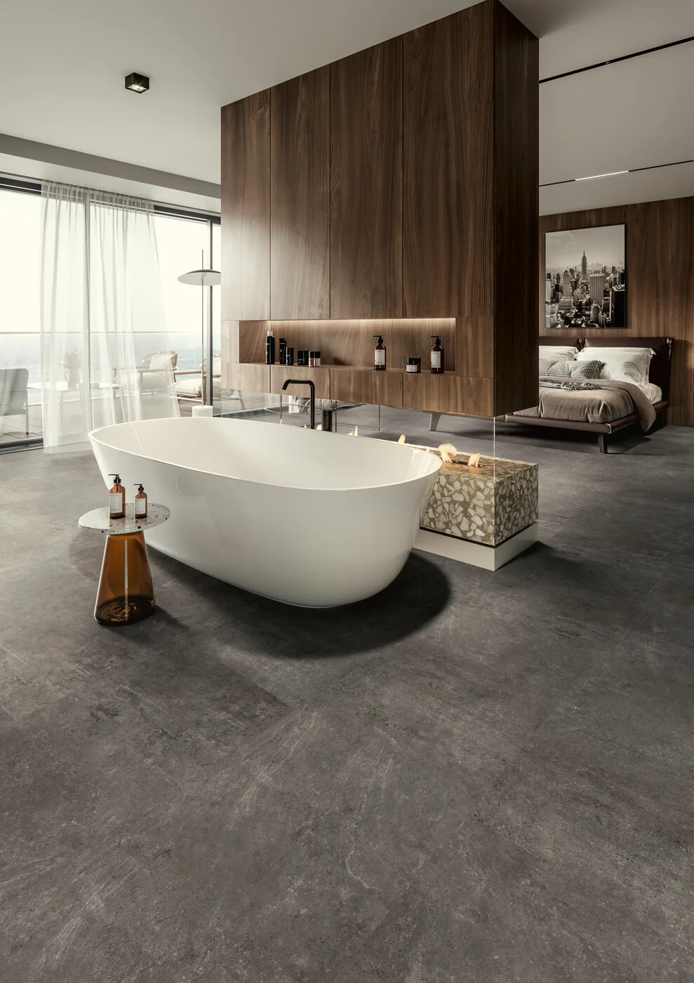Veliki format betona s prirodnim varijacijama za moderan industrijski izgled.